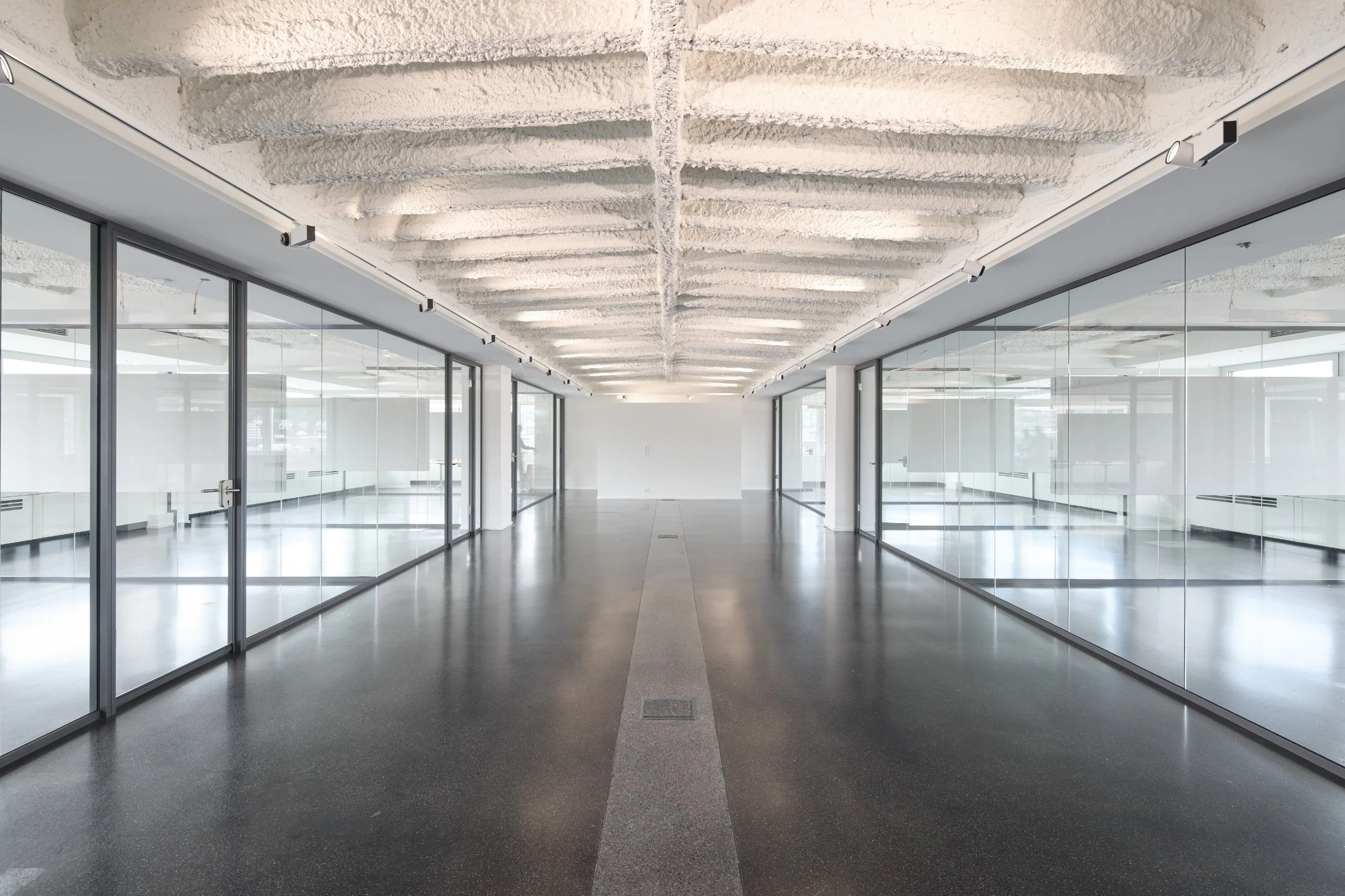 Einen besonderen gestalterischen Reiz bot die Deckenkonstruktion aus Stahlbetonrippen und längs verlaufenden Unterzügen, die sich wie ein Flügel über die Etage spannt. Da diese Rohbaustruktur brandschutztechnisch ertüchtigt werden musste, wurde ein Brandschutz-Spritzputz aufgebracht, der die charakteristische Rippengeometrie weiterhin erlebbar lässt. Der Verzicht auf eine abgehängte Decke schuf zusätzliche Raumhöhe und verstärkt die räumliche Großzügigkeit.